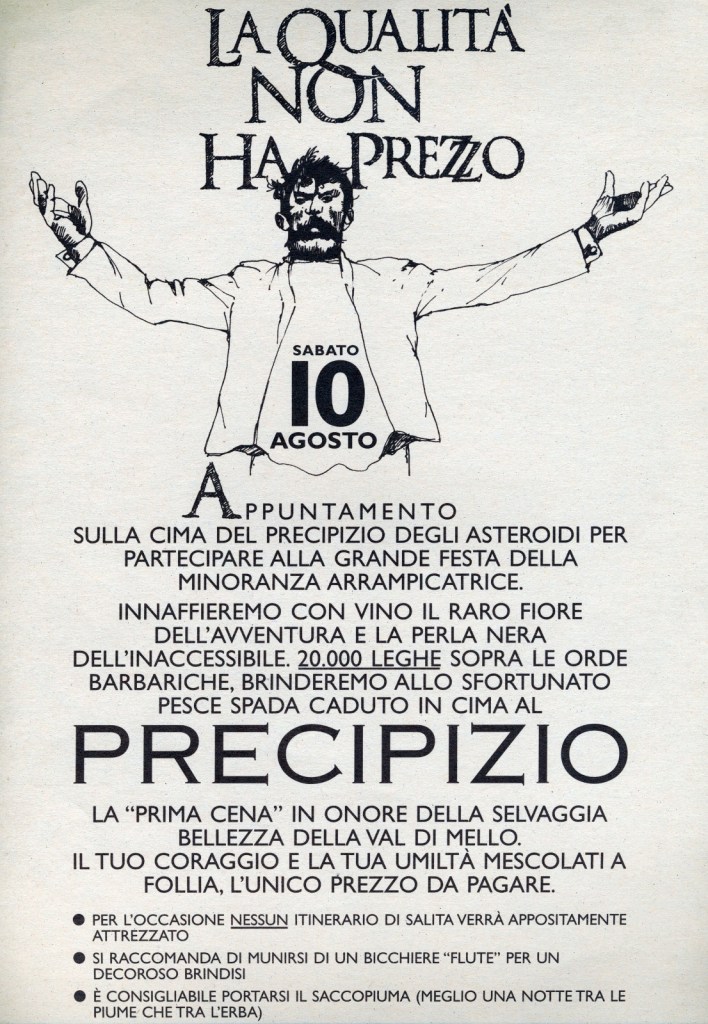 Eravamo un gruppuscolo di post-adolescenti, tormentati dalla voglia di vivere. Sempre perdutamente innamorati: grandi amori, grandi progetti di scalate e di conquiste femminili. L’amicizia, sì, è stata sempre fondamentale, anche perché l’arrampicata è molto elitaria. All’epoca eravamo davvero in pochi: infatti la festa era dedicata a una minoranza arrampicatrice.