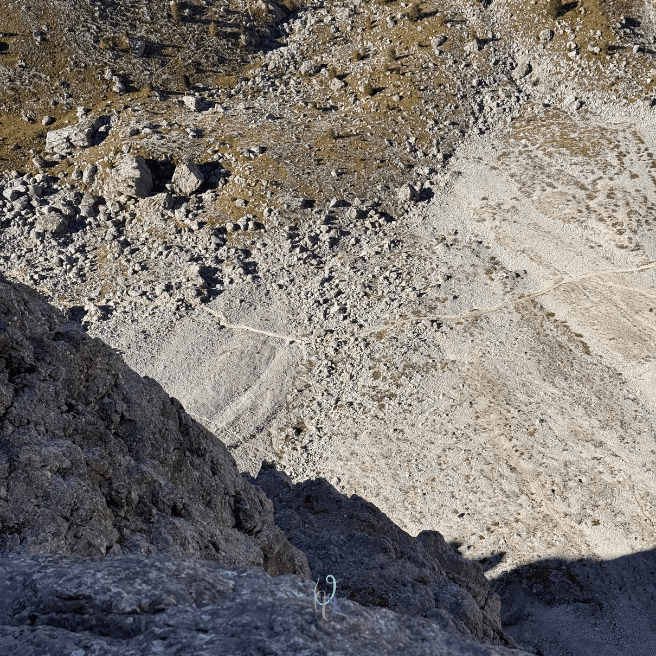 Infine un breve tiro di venti metri e III grado ci porta all’arrivo della via normale. Dato il buon orario, ci concediamo un altro tiro corto fino alla vetta, dove indossiamo le scarpe, ci crogioliamo al sole e poi giù, con una calata fino alla normale, che percorriamo a ritroso con diversi tratti in arrampicata (wow, non è ancora finita!). Decidiamo di non utilizzare la corda, quindi allo stesso tempo decido che non devo volare. Non ho altro da dire.