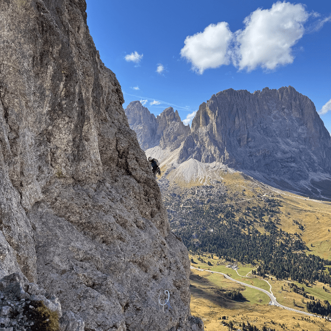 Famoso per le sue salite in libera e per il suo parsimoniosissimo utilizzo di chiodi, Messner ha tracciato una linea sulla parete nord della Seconda Torre del Sella che oggi tutti conoscono. L’ha fatto nell’agosto del 1968. La via è diventata una classica, come si è soliti dire. Ma anche una via un po’ temuta, non per il grado (fino al VI-), ma perché è facile perdersi: i chiodi sono pochissimi, al contrario delle vie vicine, che sono parecchie e possono portare fuori strada.