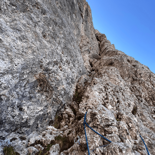 Il primo tiro è una lunga curva verso destra. Sulla roccia grigia a pochi metri il mio compagno di cordata predilige la fessura di destra (che probabilmente è un VI) e io lo seguo, ma già capiamo che quella giusta di V grado è la fessura parallela di sinistra a circa due metri di distanza. Non importa: arriviamo alla sosta e procediamo.