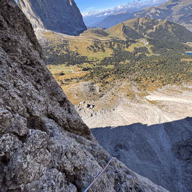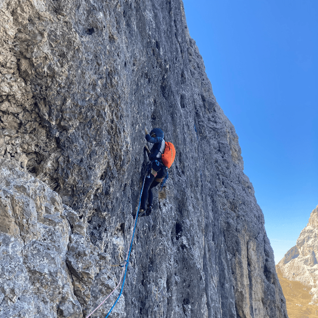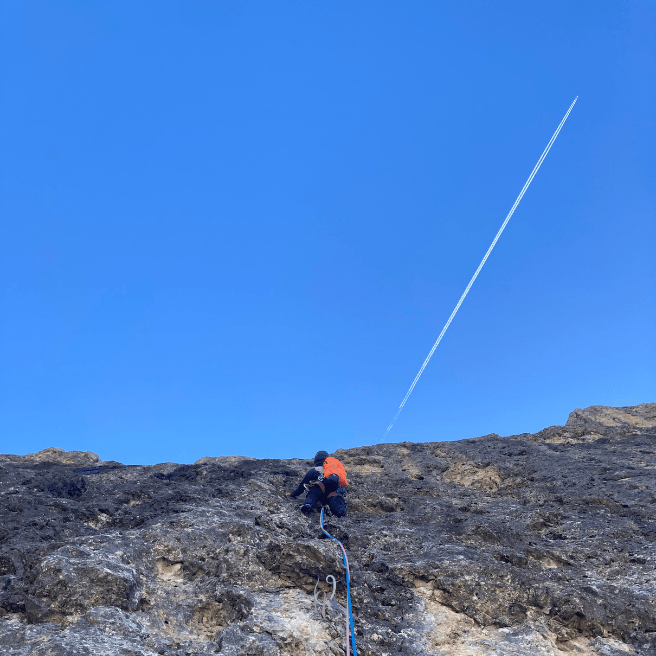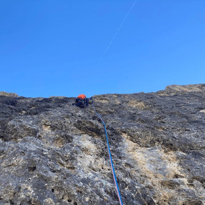 Il facile diedro lo percorriamo per 30 metri senza protezioni fino alla sosta e poi saliamo una fessura e un’altra placca che ci portano ad attrezzare la sosta sette.