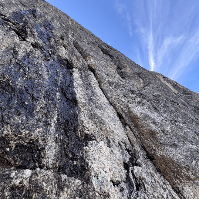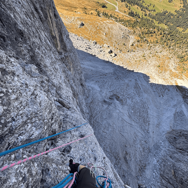 Avevamo intravisto la linea quando abbiamo salito la Vinatzer alla Terza Torre ed è subito stato amore: quelle placche verticali che da lontano sembrano lisce, quel calcare grigio compatto che non vede il sole… tutto sembra promettere bene.
