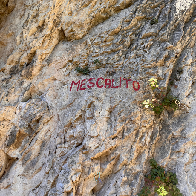 La via Mescalito è stata aperta da Renzo Vettori e Renato Bernard nel 1982: strabiliante se pensiamo che questi due scalatori hanno trovato una linea logica che vince una parete liscia con difficoltà contenute (i passi indicati come A0 sono di 6c e 7a, mezzo grado più, mezzo grado meno). Sono state usate poche protezioni e la via è stata aperta dal basso: “ritengo abbia rappresentato in quegli anni un passo avanti nella storia dell’arrampicata in Valle del Sarca e non solo…” (dalla guida di Diego Filippi).