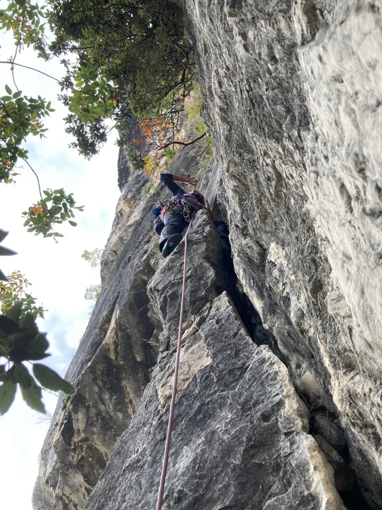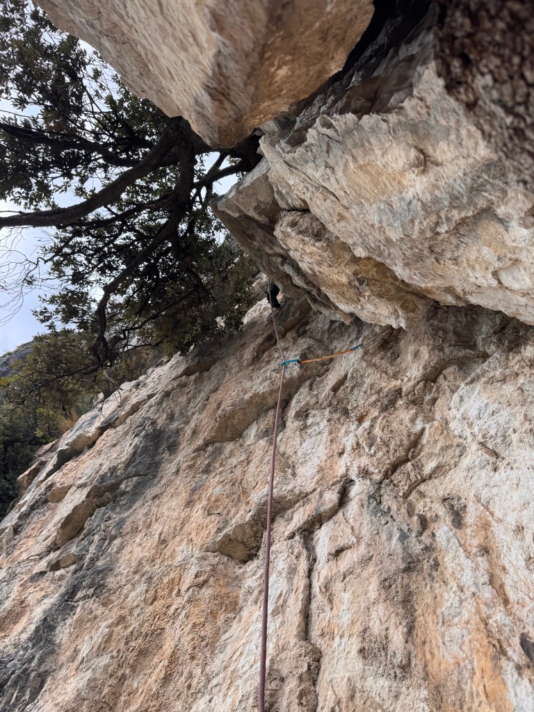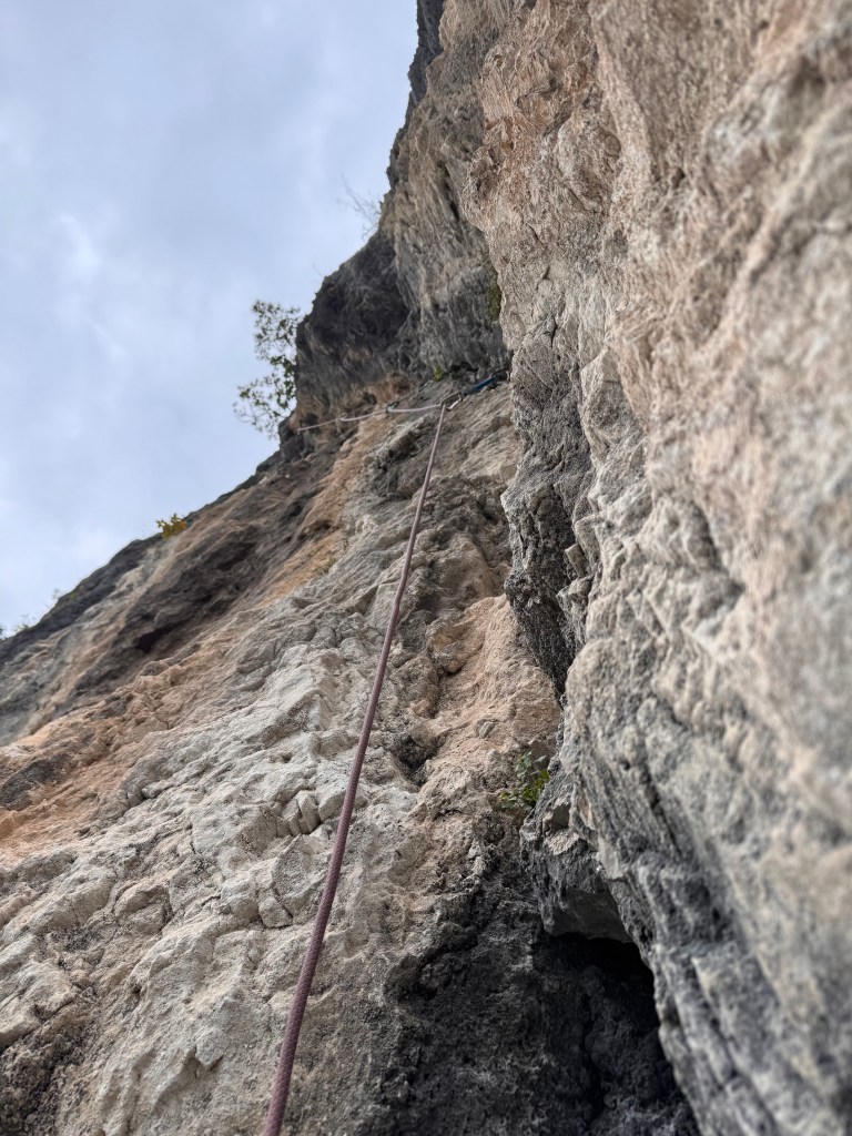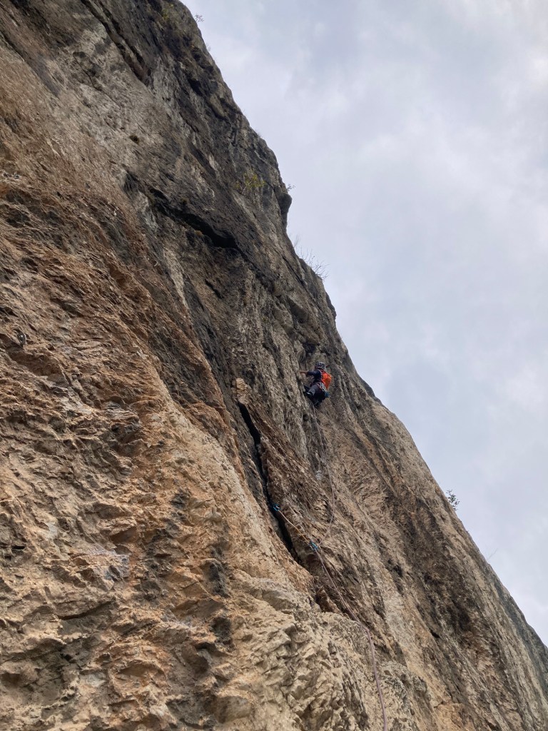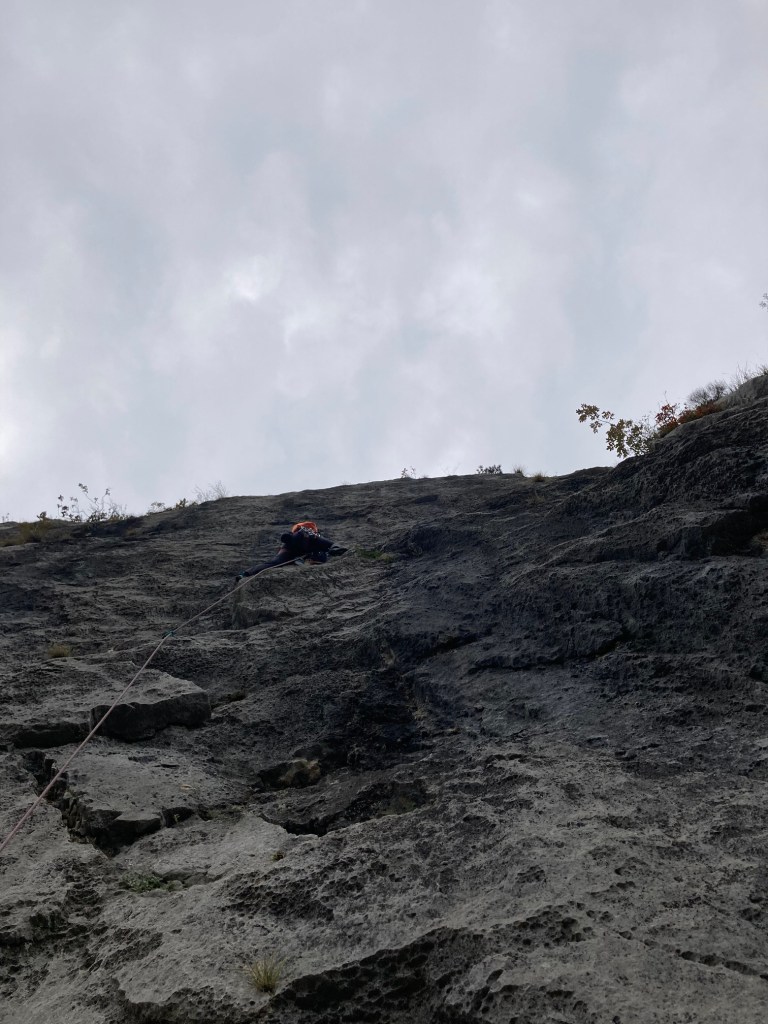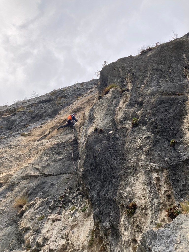 Oltre la comoda cengia, a metà via, la parete ricomincia verticale, alternata da alcuni strapiombi che ci impegnano, offrendoci però un’arrampicata magnifica, in un vuoto esaltante.