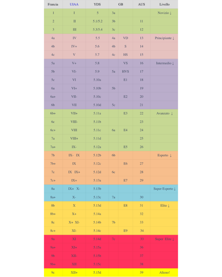La combinazione britannica di numeri e lettere, identica a quella francese, rivela l’inaspettato: i gradi possono essere paragonati a quelli della scala francese, ma dobbiamo aggiungere due gradi. Quindi un 5b britannico diventa un 6a francese, un 6a britannico diventa un 6c francese. Il paragone non è perfetto, ma ci dà un’idea.