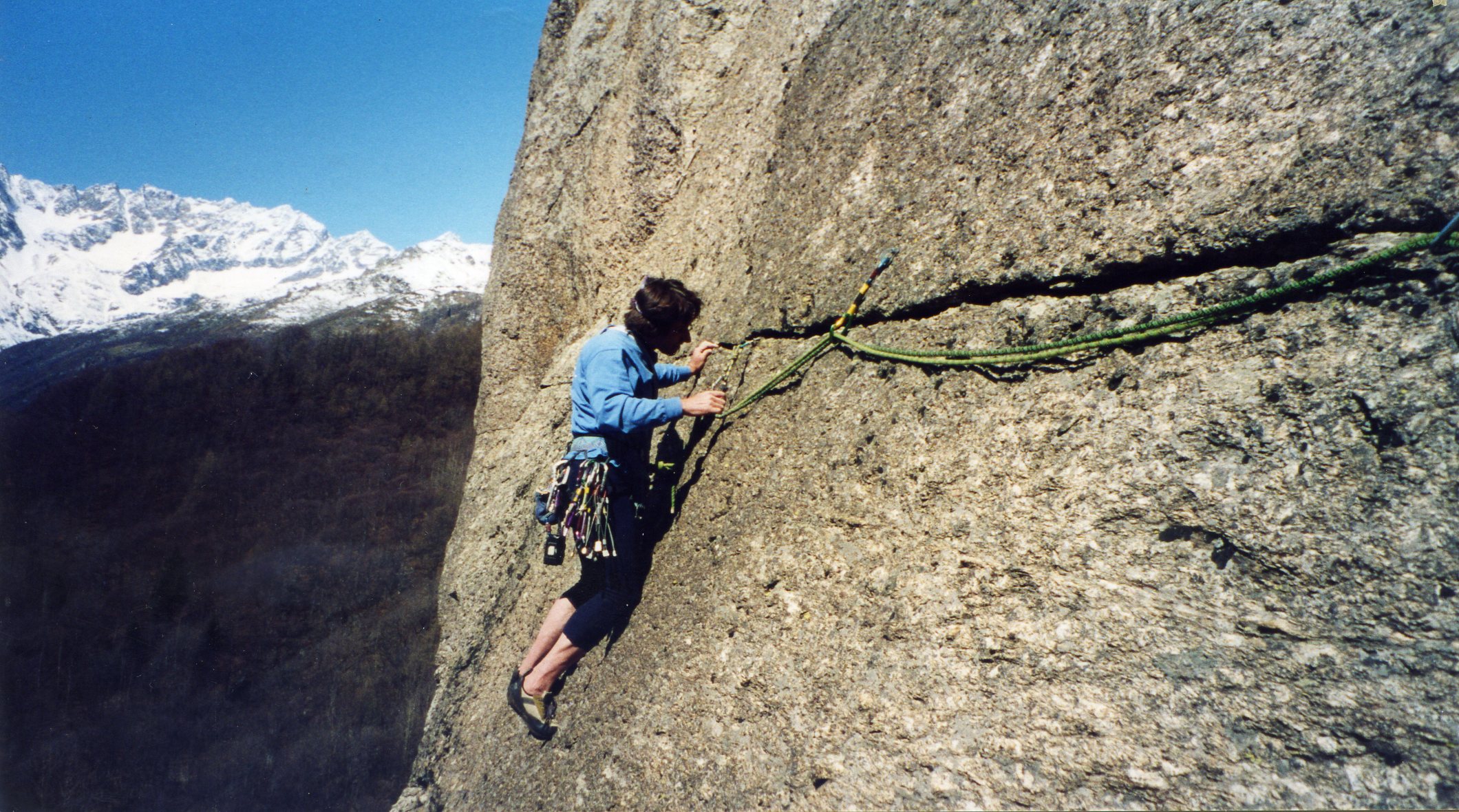Una sera in pizzeria a Locana lo incontro e iniziamo a chiacchierare: lui era convalescente da un’operazione al ginocchio e aveva il tutore. Gli racconto entusiasta che anche io avevo iniziato ad arrampicare con un gruppo che frequentava la Val di Susa, ma in quel momento, a causa di un brutto incidente accaduto a una mia amica, ero in pausa.