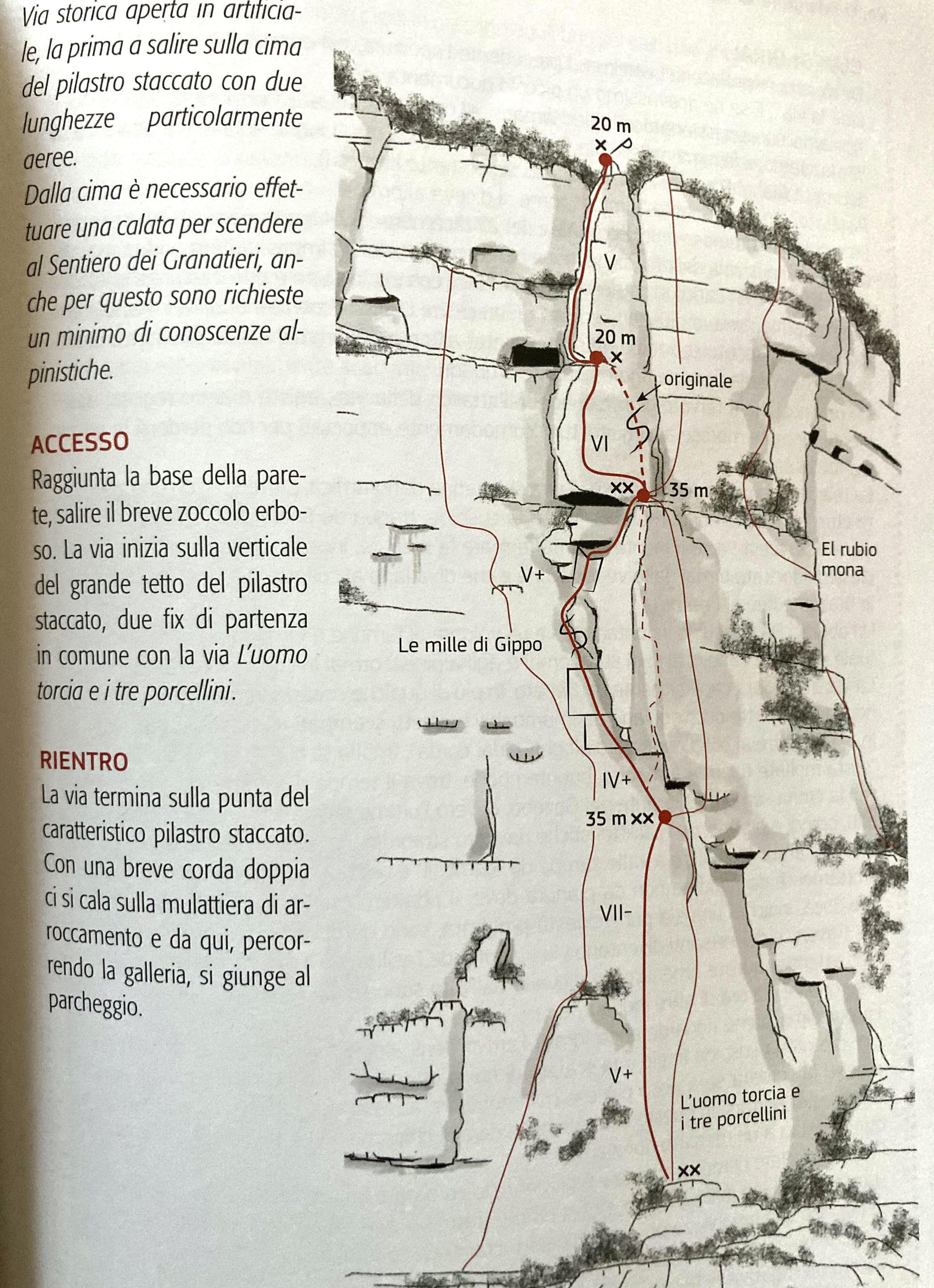 “La via è ben chiodata: chiodi normali, clessidre e qualche pianta, sono molto utili o necessari una serie di friends medio-piccoli B.D. dal 1 (rosso) al .3 (blu piccolo), portare per ogni evenienza anche qualche chiodo. Le difficoltà vanno dal 4° al 6°, due passi di 6+ e uno di 7. La difficoltà massima obbligatoria è 6° e A0.”