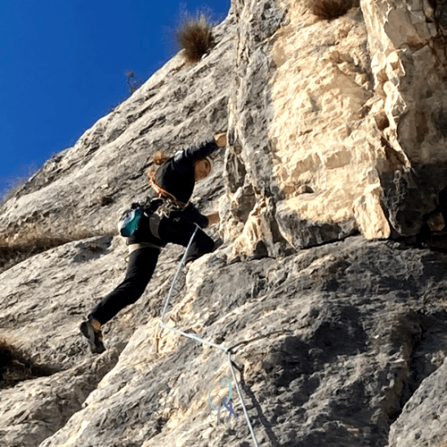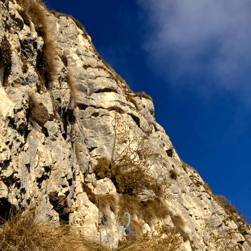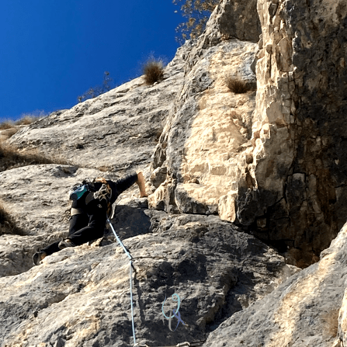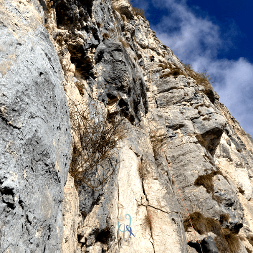 Ha uno sviluppo di 200 metri, il grado massimo è 6b+ (6a+ obbligatorio), ha 6 lunghezze, è RS2 ed è dedicata all’anziano caprone che abita nel Cengio: si chiama Signor Kapriz. Ah, giusto: per chi ancora non lo conoscesse, il Signor Kapriz è il caprone e così è stata chiamata anche questa bellissima via sulla bastionata orientale del Monte Cengio, aperta nel novembre 2022 da Fausto Carollo, Elena Girardi e Mario Schiro. Loro non hanno bisogno di presentazioni.