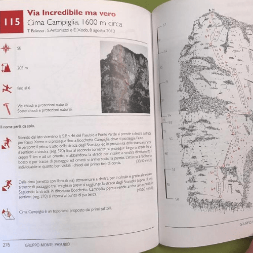 “Itinerario “storico” dell’arrampicata moderna nelle prealpi vicentine: è diventata una via classica grazie alla buona chiodatura e alla compattezza della roccia.” dalla guida di Guido Casarotto.