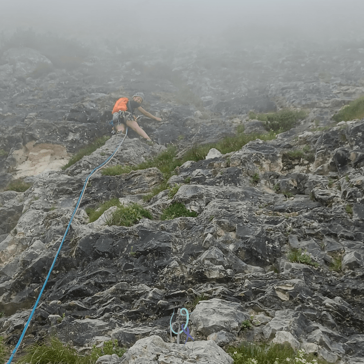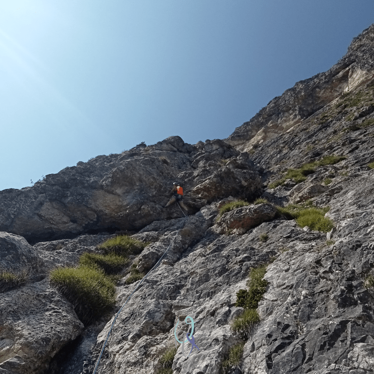 Roccia a tratti friabile. Fare attenzione a rocce mobili e detriti sulle cenge.