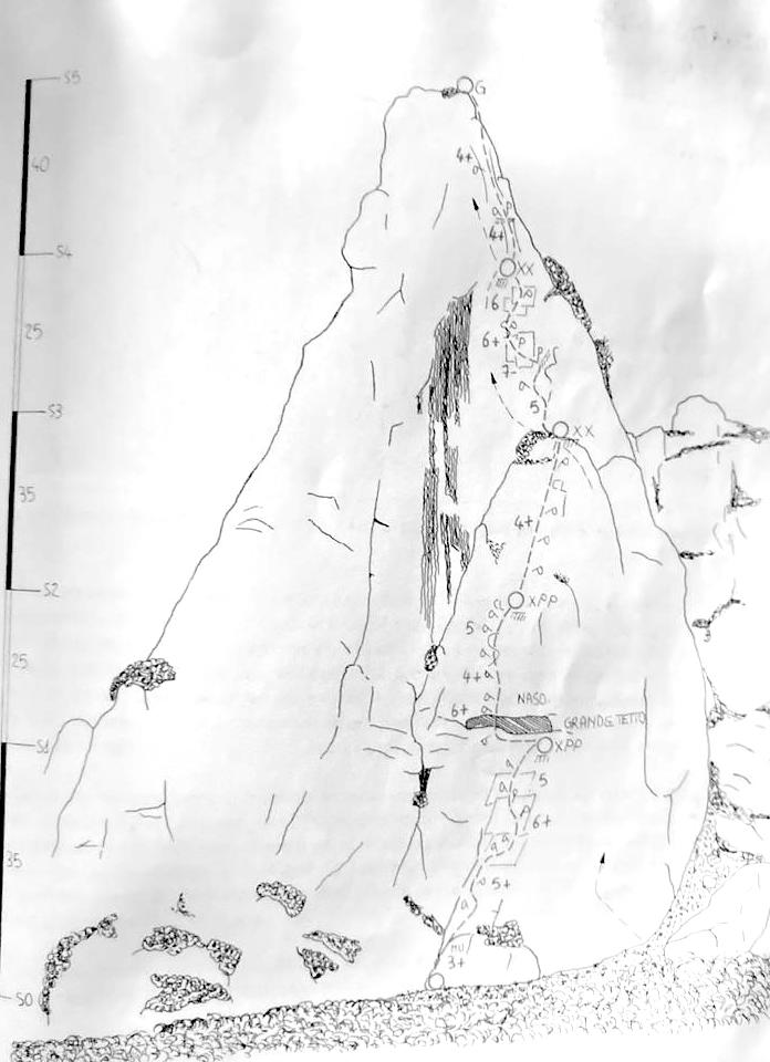 Avvicinamento: 25 minuti dal rifugio Campogrosso. (si sale il canale in corrispondenza del pilastro NE (targa Furlani), poi si attraversa a sinistra per raggiungere un cengia (passaggi di II grado). Si oltrepassano le “Canne Carugati” e in corrispondenza del tetto di attacco della Tranquillo e Placido, si attraversa a destra, si sale per alcuni metri e ritornando a sinistra si sale sul terrazzino dove inizia la via)