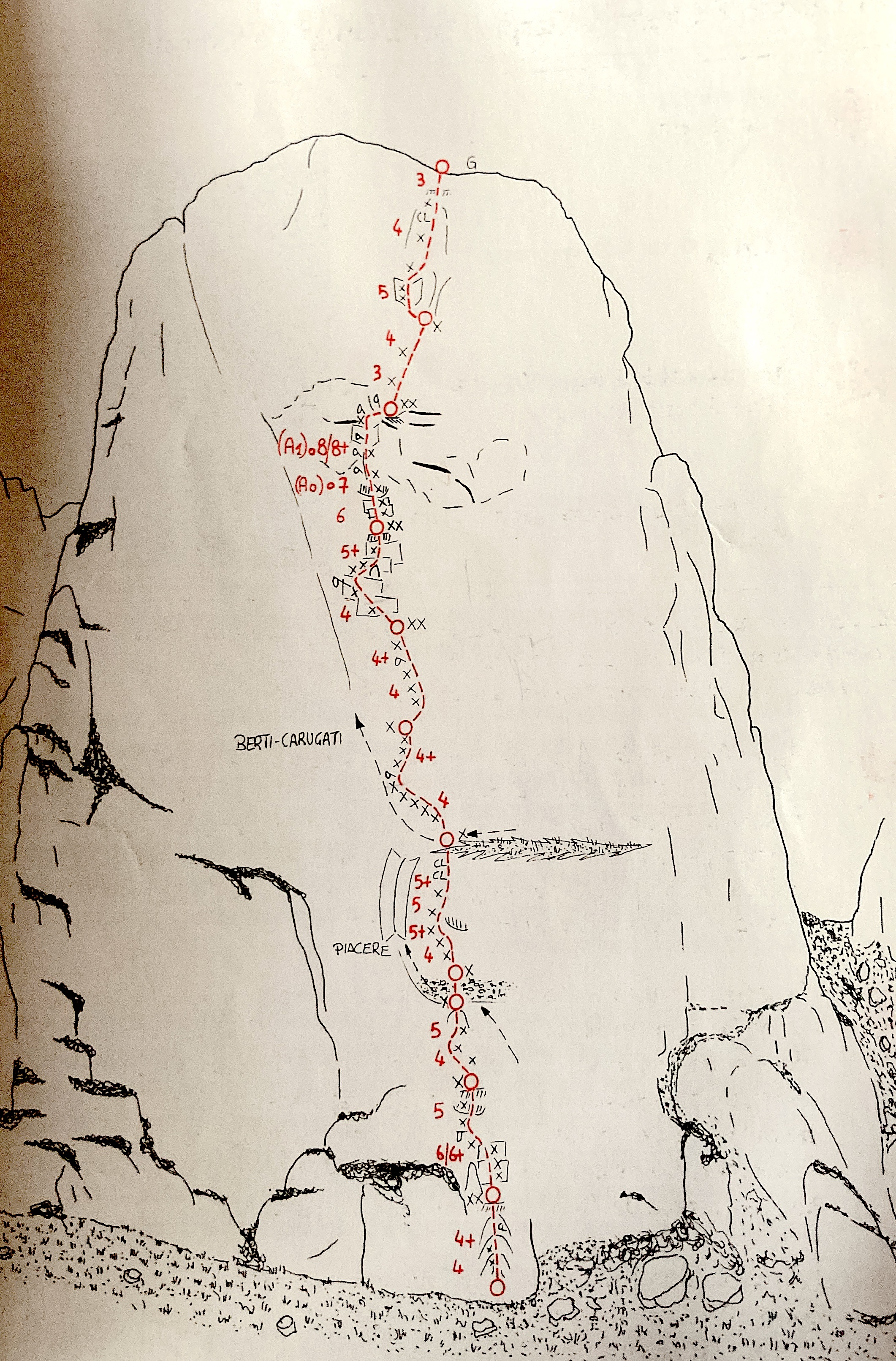 Protezioni: chiodi (pochissimi, ma non sono necessari friend), soste con golfari a parte quella del quinto (o sesto) in una nicchia con due chiodi, ma sicura.