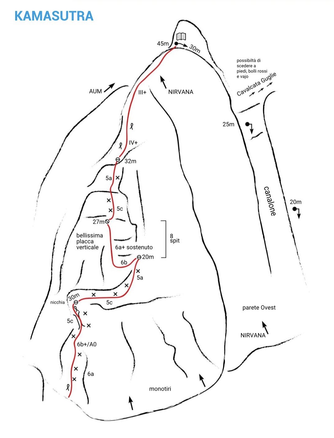 Sviluppo: 350 metri, salita di facile intuizione grazie alle numerose protezioni e alla linea logica.