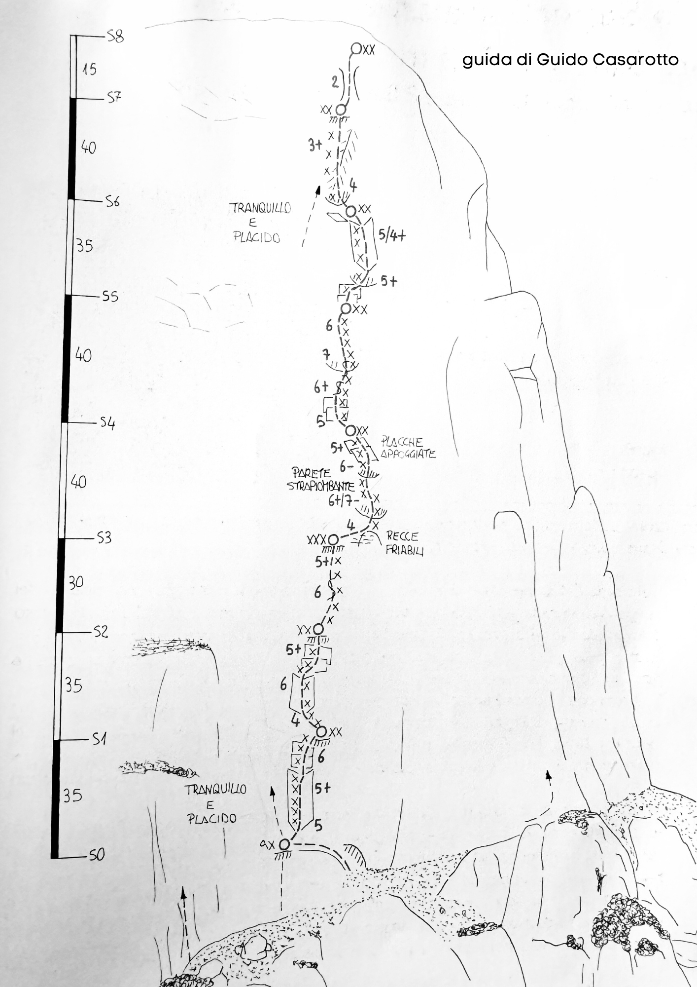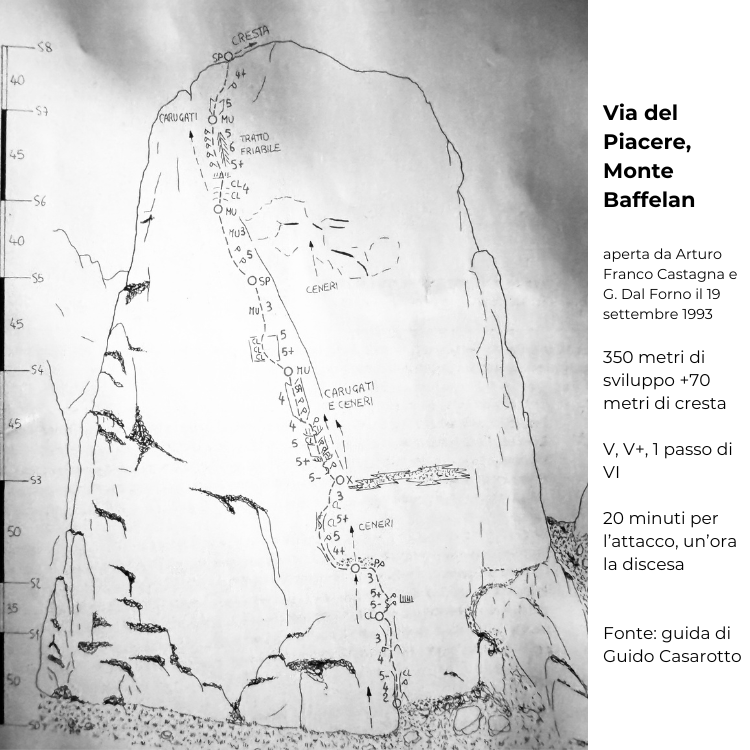 “Splendida linea che percorre la parete est del Baffelan. Per la qualità della roccia, l’esposizione e la magnifica salita, la via merita almeno una ripetizione” Guido Casarotto.