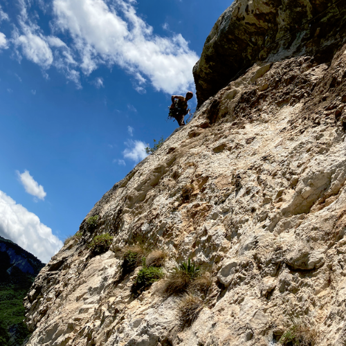 I tiri sono brevi, ma intensi. Meritevole soprattutto il terzo tiro con un diedro e un traverso in cui l’equilibrio è particolarmente essenziale.
