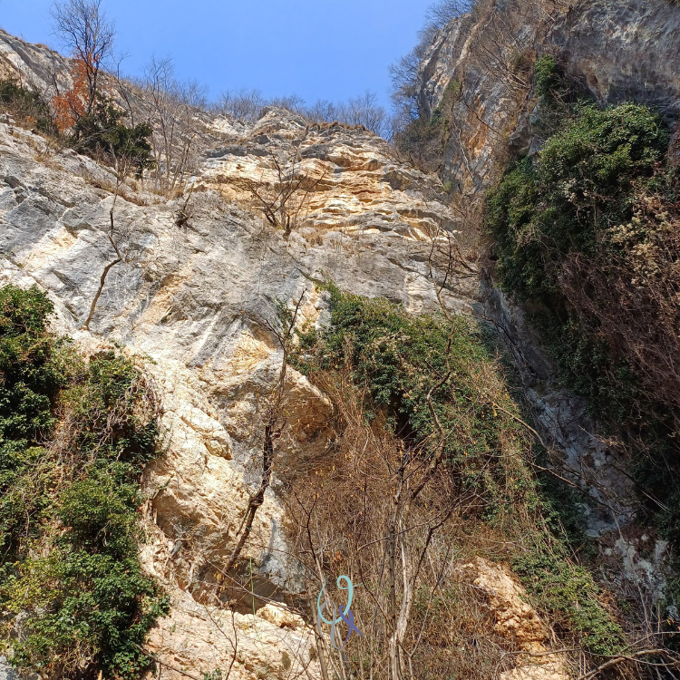 In alternativa al tiro di 8a+, a destra della penultima sosta è possibile percorrere qualche metro a destra su cengia erbosa e finire con l’ultimo tiro della via Fuori di linea con un passo di 6c.