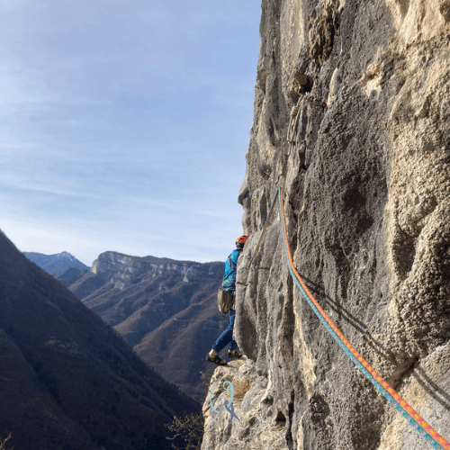I tiri sono 5 se poi si sceglie di scendere con calate in doppia. Se si vuole scendere per il sentiero, c’è un altro tiro da fare, anche questo di minimo 6b.