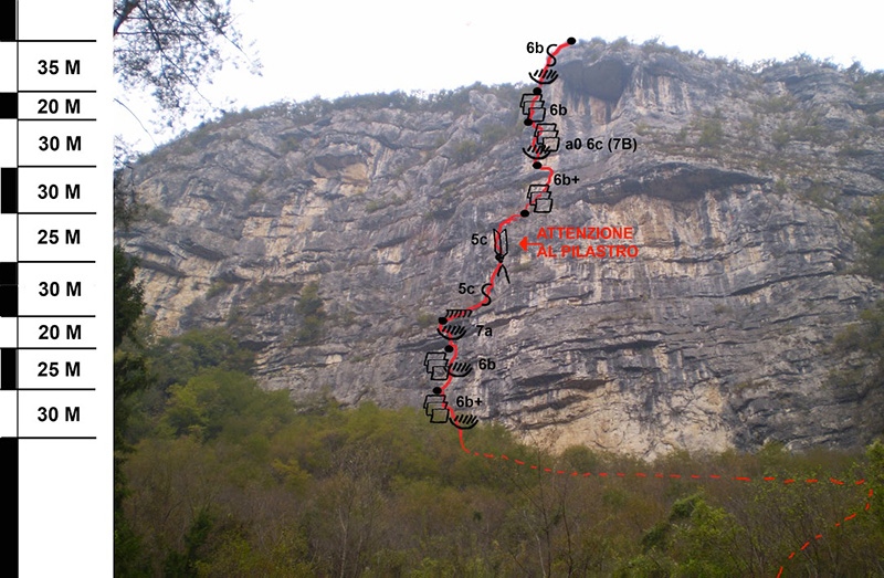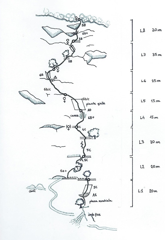 Salita: 1) 40 m; 5b e 5c; al chiodo con cordino piegare a sinistra e seguire la fessura. 2) 25 m; 6a continuo. 3) 20 m; 6a e 6b+ la pancia chiave. 4) 30 m; 6a+. 5) 30 m; 5a e vegetazione (tiro sporco e facoltativo).