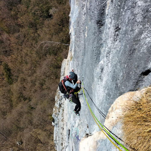 I tiri sono 7 e poi è possibile calarsi in doppia, ma per chi vuole procedere, si fa sosta sulla rete paramassi e poi si prosegue a sinistra nel bosco per poi scendere lungo il solito ripido sentiero a tornanti.